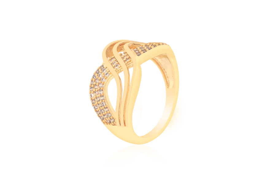 ANEL BANHADO EM OURO, 3 FIOS TRABALHADOS, COM ZIRCÔNIAS