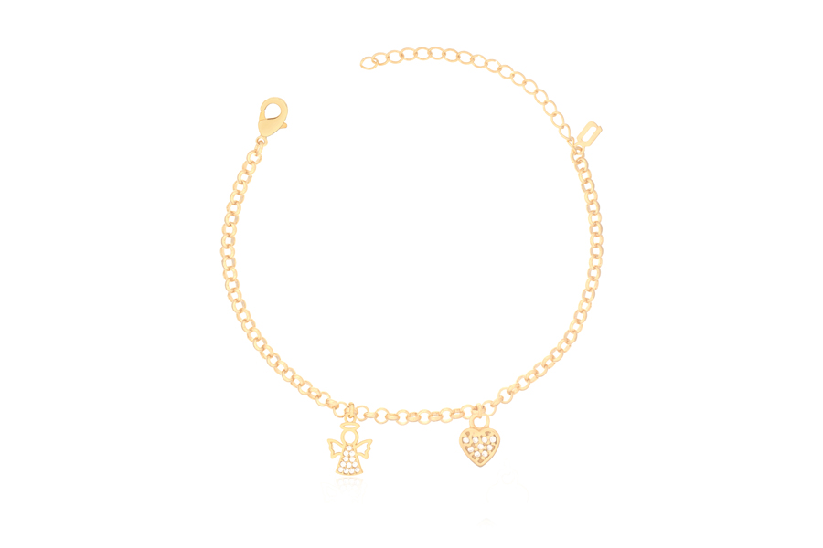 PULSEIRA BANHADA EM OURO, ELO PORTUGUÊS 2,50mm, 13cm COMPRIMENTO, EXTENSOR 3cm, CORAÇÃO E ANJO 13mm ALTURA